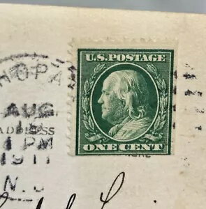 1911 年のポストカードに印刷されているベンジャミン フランクリン グリーンの 1 セント切手。