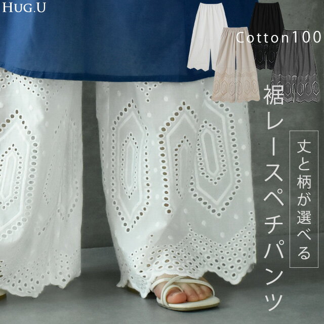 超便利「ワンピに重ねる 裾パンツ 」 ペチパンツ レディース パンツ ペチコート ボトムス インナー レイヤード 重ね着 レース 綿 コットン ワイドパンツ 静電気防止 体型カバー ウエストゴム ワイド 黒 白 ホワイト ペチ 大きいサイズ 春 冬 HUG.U