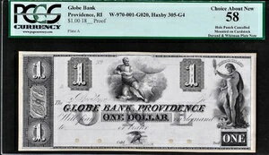 プロビデンス、ロードアイランド州、1800年代のグローブバンクプルーフ、PCGS AU58、アメイジングアッパーエシュロンペディグリー