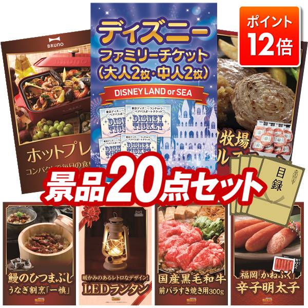 ★ポイント12倍★12/4 20:00 〜要エントリー!忘年会景品 20点セット 特大パネル 豪華目録 ビンゴ 結婚式 披露宴 二次会 忘年会 新年会 ゴルフコンペ 景品セット 【ディズニーファミリーチケット(大人2枚 中人2枚)、BRUNO コンパクトホットプレート】