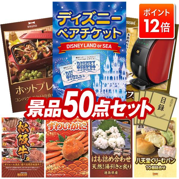 ★ポイント12倍★12/4 20:00 〜要エントリー!忘年会景品 50点セット 特大パネル 豪華目録 ビンゴ 結婚式 披露宴 二次会 忘年会 新年会 ゴルフコンペ 景品セット 【ディズニーペアチケット、BRUNO コンパクトホットプレート】 送料無料 特大パネル 豪華目録付き