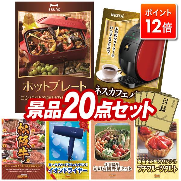 ★ポイント12倍★12/4 20:00 〜要エントリー!忘年会景品 20点セット 特大パネル 豪華目録 ビンゴ 結婚式 披露宴 二次会 忘年会 新年会 ゴルフコンペ 景品セット 【BRUNO コンパクトホットプレート、ネスカフェ バリスタ】 送料無料 特大パネル 豪華目録付き