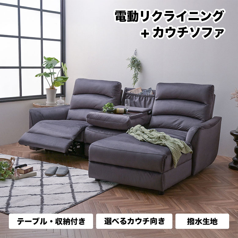 【12/4 20:00から使える★4h限定5%offクーポン配布中】 電動リクライニングソファ カウチソファ 片側 3人掛けソファ ハイバック テーブル付き カップホルダー 撥水 ファブリック 布 グレー おしゃれ モダン リクライニングソファー 3人掛け ソファー フットレスト