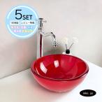 5点セット 洗面ボウル+単水栓+排水栓+台座+排水トラップ ガラス 手洗い器 小さい 丸 置き型 蛇口 おしゃれ 透明 赤 INK-0406018H-0302077Hset