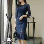 総レース マーメイド パーティードレス ワンピース ネイビー 紺 七分袖 袖あり ミディ丈 上品 エレガント 二次会 結婚式 お呼ばれ ドレス