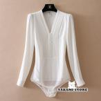 【裾が出ない】ボディシャツ ブラウス レディース 長袖 Vネック 下着が見えない かがんでも大丈夫 ボディースーツシャツ シフォ