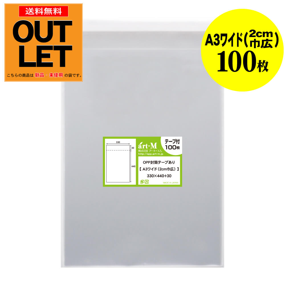【訳ありアウトレット】テープ付 A3ワイドタイプ【2cm巾広】 透明OPP袋 【100枚】 【A3用紙 / ポスター用】 30ミクロン厚(標準) 330x440+30mm 【二つ折りにて発送】