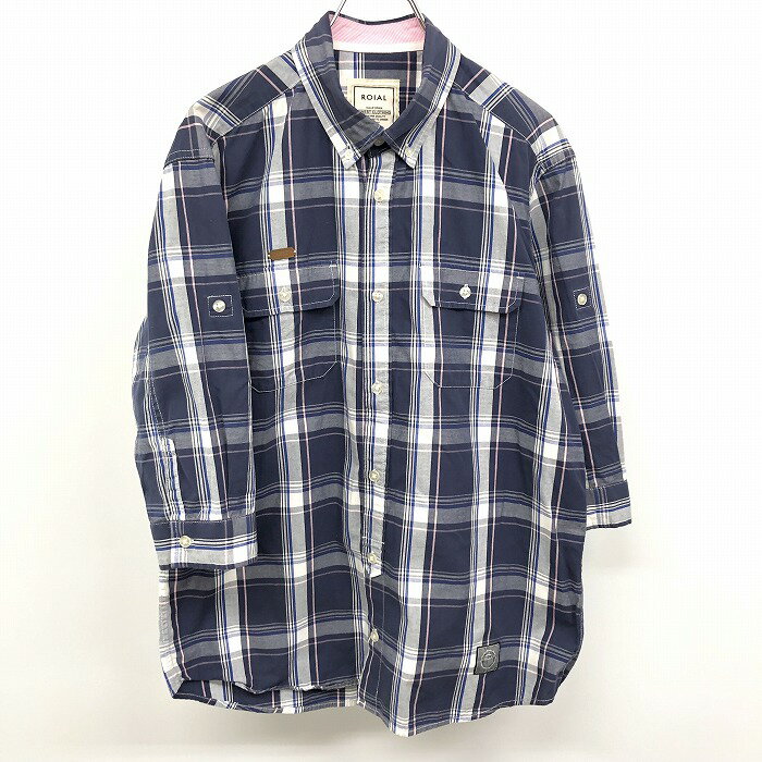 【楽天スーパーSALE限定!! \★35%OFF★/対象商品|12月4日(木)20時00分〜12月11日(木)01時59分まで】【中古】ROIAL ロイアル M メンズ シャツ チェック 7分袖 ボタンダウン 袖ロールアップ 両胸ポケット ポリ×綿 ネイビー×ホワイト×ピンク 紺