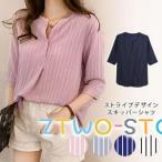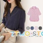 スキッパーシャツ レディース ストライプ 半袖 スキッパー 白 五分袖 ブラウスシャツ シャツ ブラウス ホワイト ネイビー ピンク ブルー チ