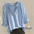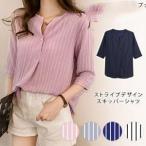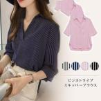 爆買 スキッパーシャツ レディース ストライプ 半袖 スキッパー 白 五分袖 ブラウスシャツ シャツ ブラウス ホワイト ネイビー ピンク ブルー チ