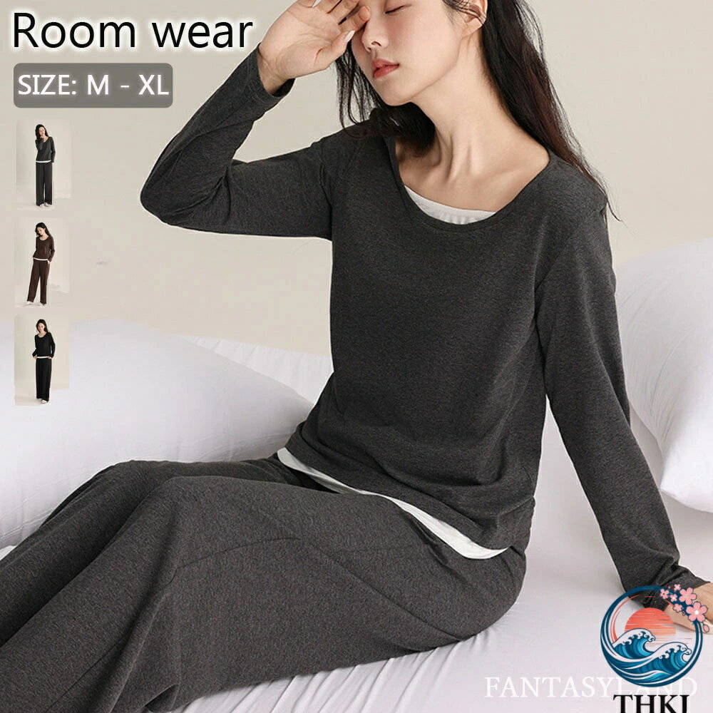 【全品2点で5%OFF】ルームウェア 部屋着 パジャマ ワイドパンツ ロングパンツ 長袖 暖かい ロング 冬 フェイクレイヤード 上下セット ナイトウェア ルームウエア 秋 春 2XL 3XL 長ズボン 20代 30代 3L 4L 綿 マタニティにも 妊婦 無地 大きいサイズ