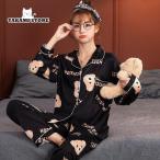 パジャマ レディース 長袖 かわいい 春 秋 ルームウェア 入院 マタニティ 部屋着 上下2点セット ロングパンツ 韓国風 寝巻きカジュアル ブラック