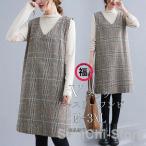 ジャンパースカート Vネック 総柄 千鳥格子柄 ワンピース 秋 冬 大人 レディース ロング マタニティ サロペット 重ね着 ノースリーブ 秋冬