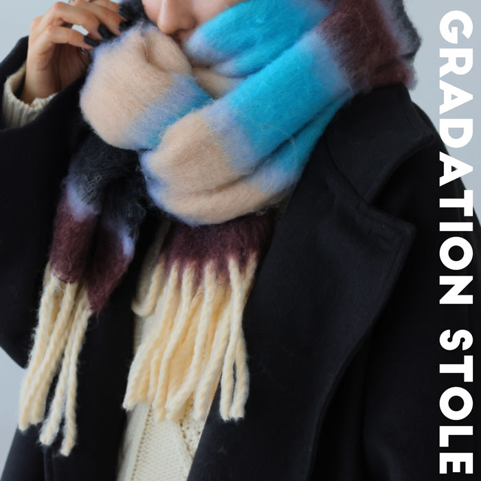 マフラー ストール 「forksy.」モヘアタッチ配色グラデーションボリュームフリンジマフラー レディース