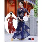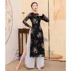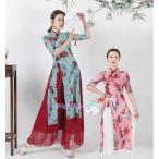古典舞踊ダンスウェア ロング丈 チャイナドレス チュール シースルー 花柄 チャイナ服 ロング ダンスウェア 七分袖 チャイナブラウス サイドスリット エレガント