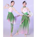 子供 中華古典ダンス衣装 蓮の花 ハス グラデーション チャイナ民族古典ダンス衣装 セットアップ 長袖 ミドル丈 後ろ長い チャイナブラウス 二重シフォン フレア