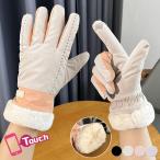 手袋 レディース 防寒 保温 裏起毛 スマホ対応 グローブ 右人差し指 ハート 刺繍 ロゴ ワンポイント バイカラー 手首まで 防風 黒 冬