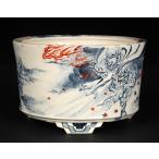七代渋草柳造染付山水風神雷神図丸鉢 盆栽鉢 植木鉢 盆器 作家鉢 bonsaipot shibukusa 絵鉢 絵付 しぶくさ りゅうぞう 4号 12cm 小品盆栽 ミニ盆栽に最適!