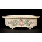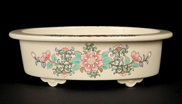 沈壽官窯色絵草花楕円鉢 盆栽鉢 鉢 植木鉢 盆器 絵付鉢 薩摩 さつま サツマ satsuma 白薩摩 ちんじゅかん 小品盆栽 ミニ盆栽 雑木盆栽に最適 送料無料
