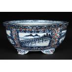 九谷理節染付赤絵窓橋図木瓜式鉢 盆栽鉢 鉢 植木鉢 盆器 藍九谷 bonsaipot kutani risestu 絵鉢 絵付 くたに クタニ 6号 17cm 小品盆栽 ミニ盆栽に最適 現品限り 一点物 送料無料
