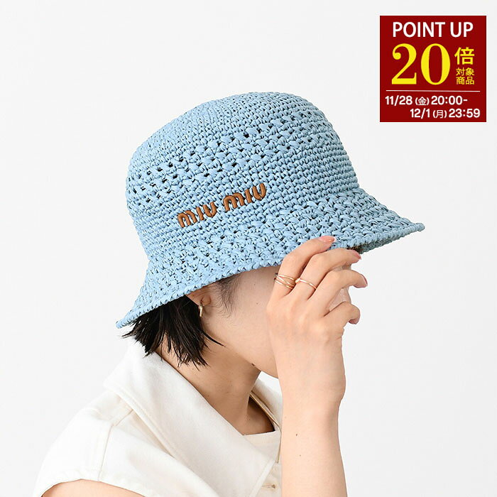 【P20倍対象商品】MIU MIU ミュウミュウ ハット 帽子 バケハ ラフィアハット 5HC287 2DO1 レディース ブルー 麦わら帽子 ウーブン ファブリック ロゴ ナチュラル 夏