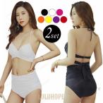ビキニ クロス 水着 レディース ハイウエスト ショーツ 2点セット 可愛い Vカット ブラック ホワイト シンプル 無地 ベーシック パッド付き