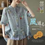 コットン リネン シャツ ブラウス 夏 半袖 薄手 トップス レディース 綿 麻 ナチュラル 涼しい ゆったり カジュアル フラワー 大人 可愛い お