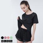 ヨガ ウェア レディース 半袖 トップス Tシャツ パンツ 2点セット ショートパンツ一体型 レギンス 上下 セットアップ 薄手 無地 黒