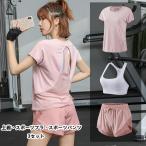 ヨガ ウェア レディース 半袖 トップス Tシャツ ブラ ショートパンツ レギンス 4点セット 上下 セットアップ 吸汗 速乾 薄手 無地 黒