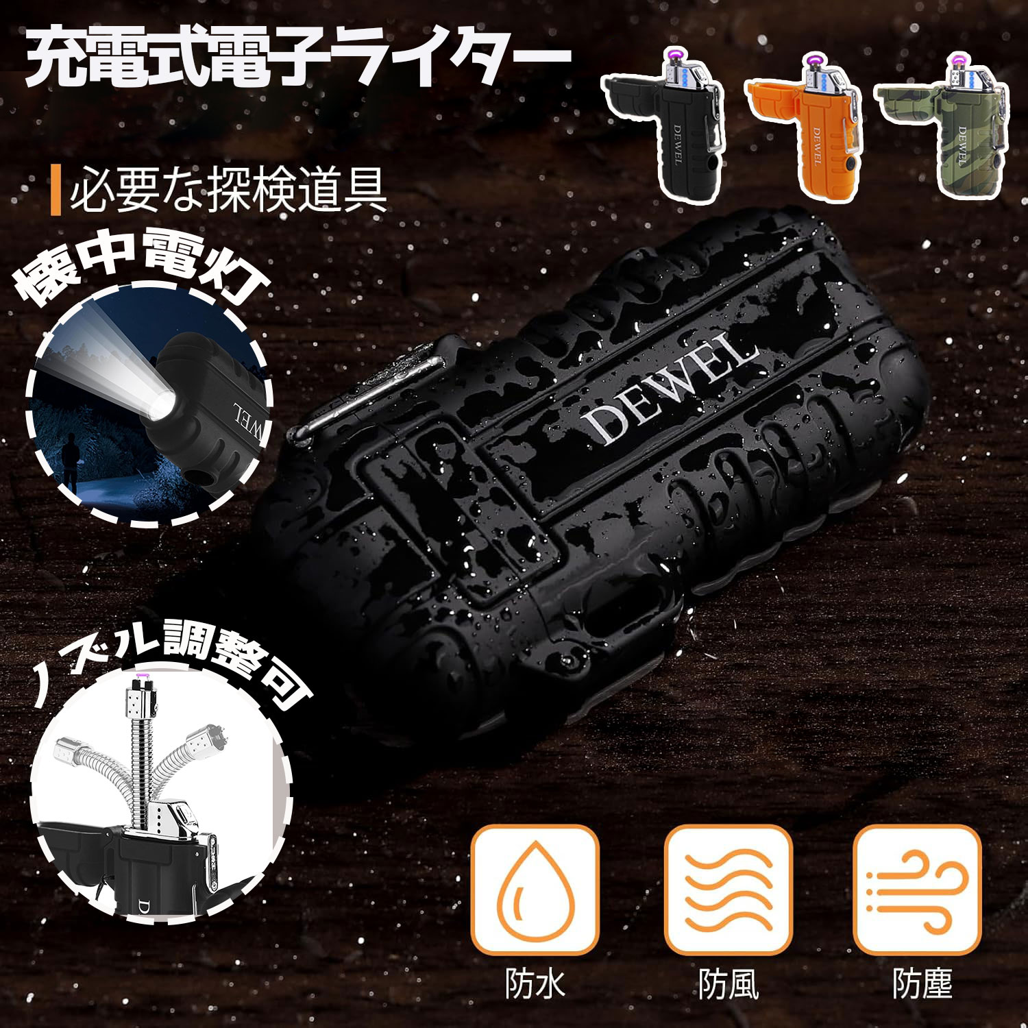 【ギフト応援SALE!10倍Px8%OFF】 DEWEL 電子ライター プラズマライター USB充電式 無炎電気ライター ノズル調整可能 防風 防水 カモフラ キャンプ/バーベキュー/花火/探検/釣りなどに適用 誕生日 父の日 プレゼント バレンタイン 男性 プレゼント ブラック オレンジ
