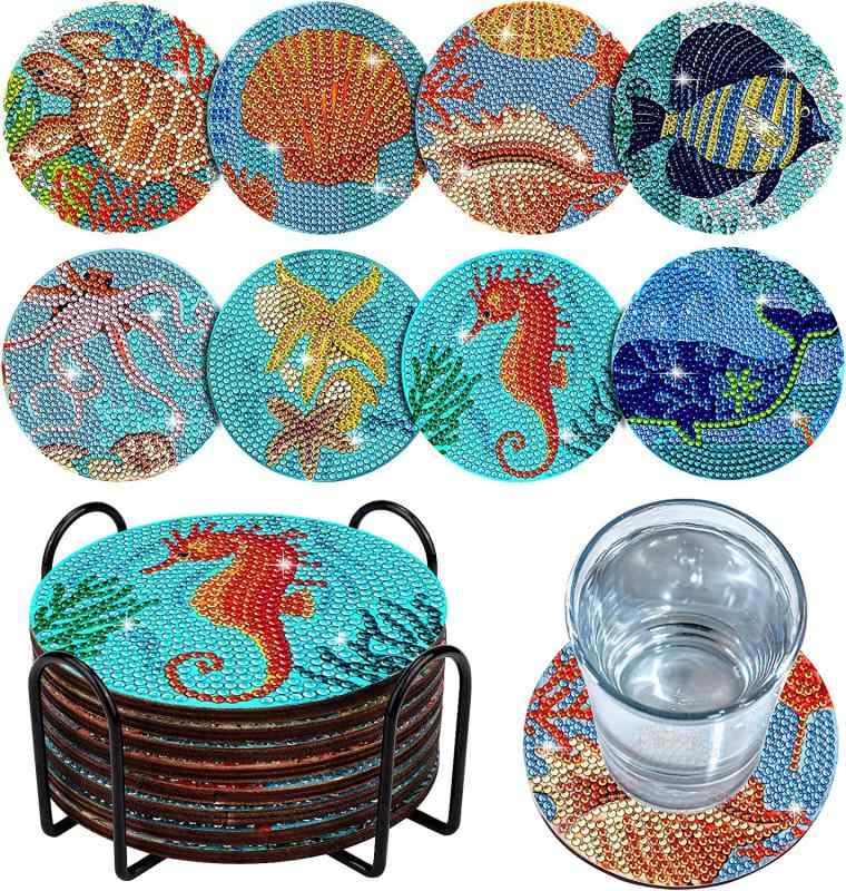 DIYダイヤモンドアート 木製 円形 10cm コースター カップマット ランチョンマット プレースマット 8枚セット フルジルコニア 海底モチーフ クリスマス バレンタイン モダン シンプル 手作りキット