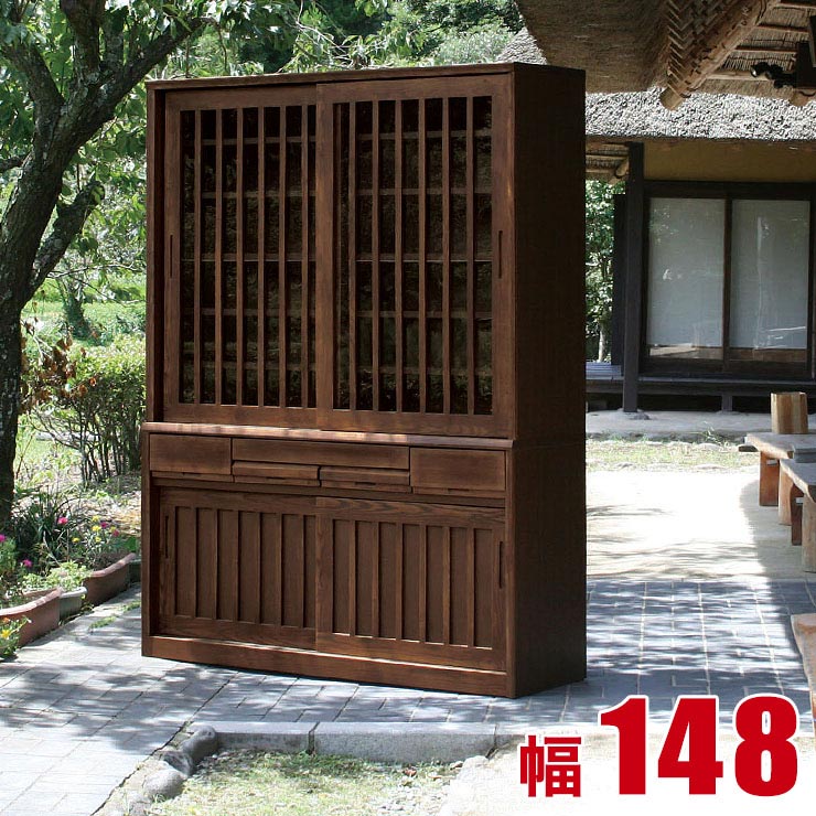 ★10%OFF★ 食器棚 大川家具 収納 引き戸 スライド 完成品 150 和風 タモ 無垢材 茶だんす 茶々 幅148cm ダイニングボード カップボード キッチンボード 日本製 完成品 日本製