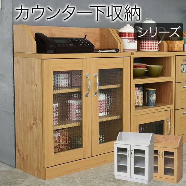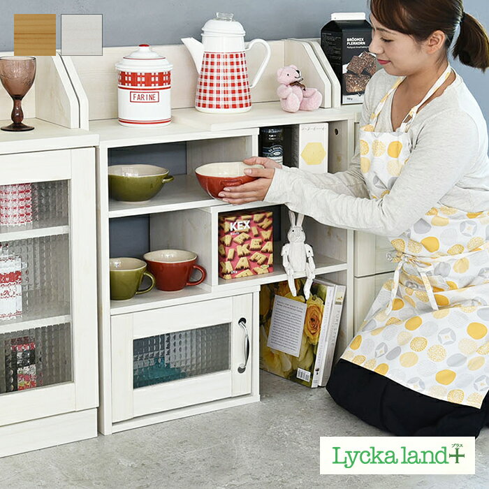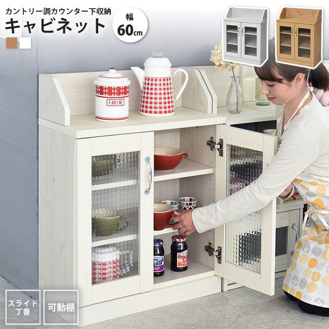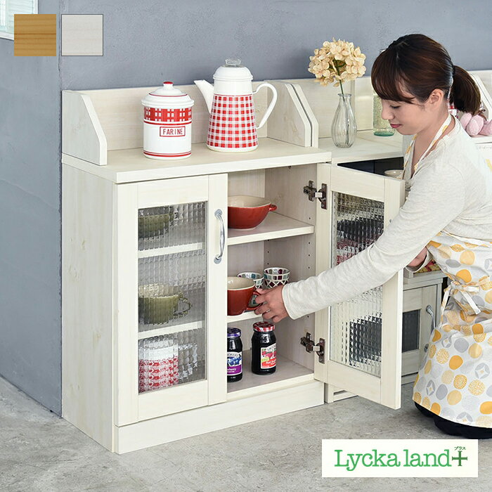 Lycka land カウンター下収納 キャビネット カントリー調 薄型 高さ80 リビングキャビネット 幅60 ガラス扉 見せる収納