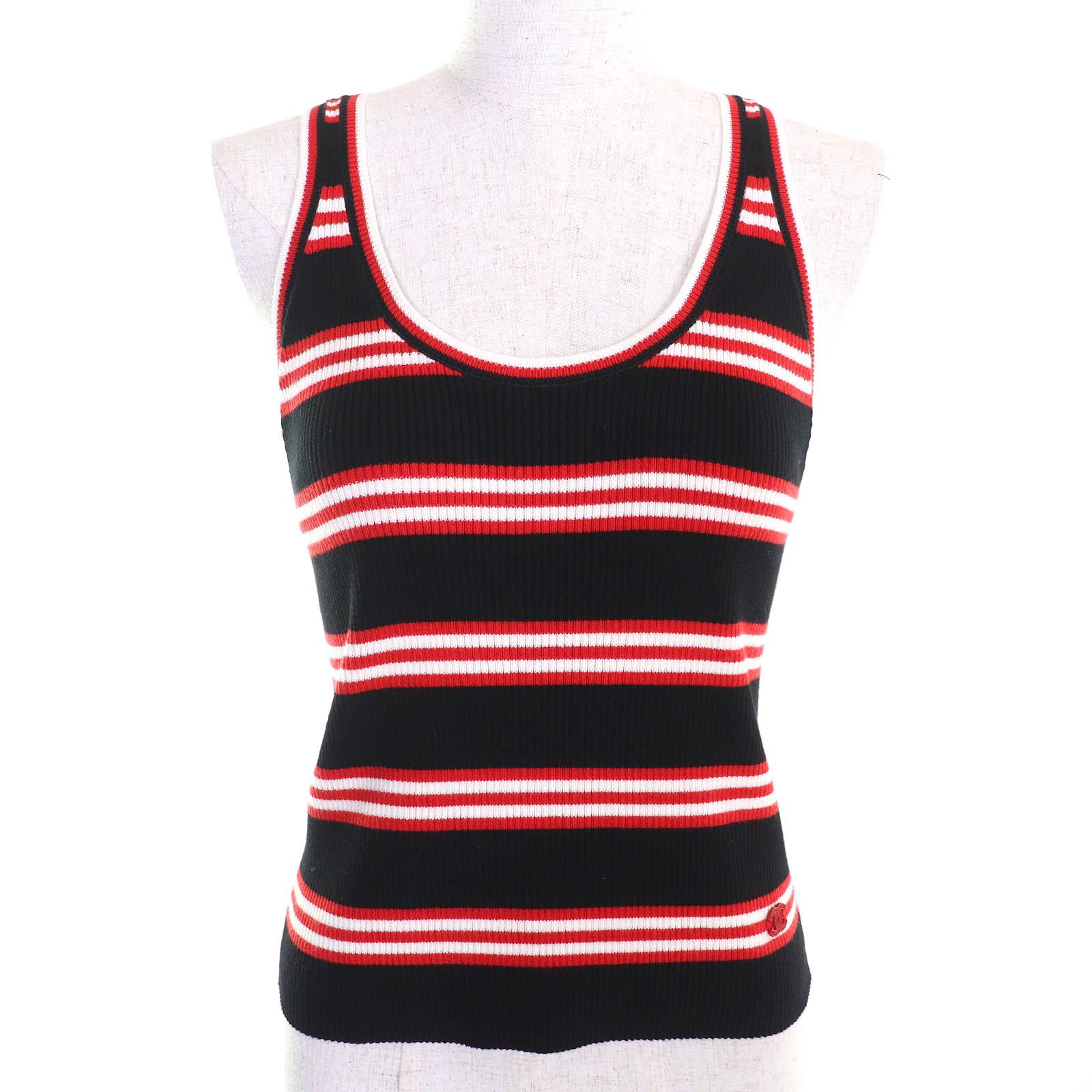 極美品△CHANEL シャネル P77660 コットン カシミヤ ココマークパーツ ボーダー柄 リブタンクトップ ノースリーブトップス ブラック レッド ホワイト 40 フランス製 レディース【中古】