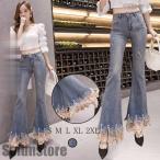 ロングデニムパンツレディース 韓国風 切り替え レース ボトムス レギンス 美脚 体型カバー デニムパンツ 着痩せ 20代30代 お出かけ/通学