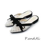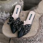 ミュール サンダル レディース ローヒール ポインテッドトゥ フラット ローファー ぺたんこ リボン飾り ドット柄 パンプス サマー 美脚