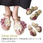 ストラップサンダル レディース ローヒール 女性 ぺたんこ アンクルストラップ レースアップ 紐 フラワーモチーフ ビーズ 上品 フラットサンダル 可
