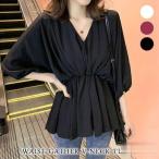 チュニック レディース 春 夏 春夏 トップス 白 黒 七分袖 ブラウス 7分袖 ホワイト ブラック ボルドー Vネック シャツ ウエストギャザー