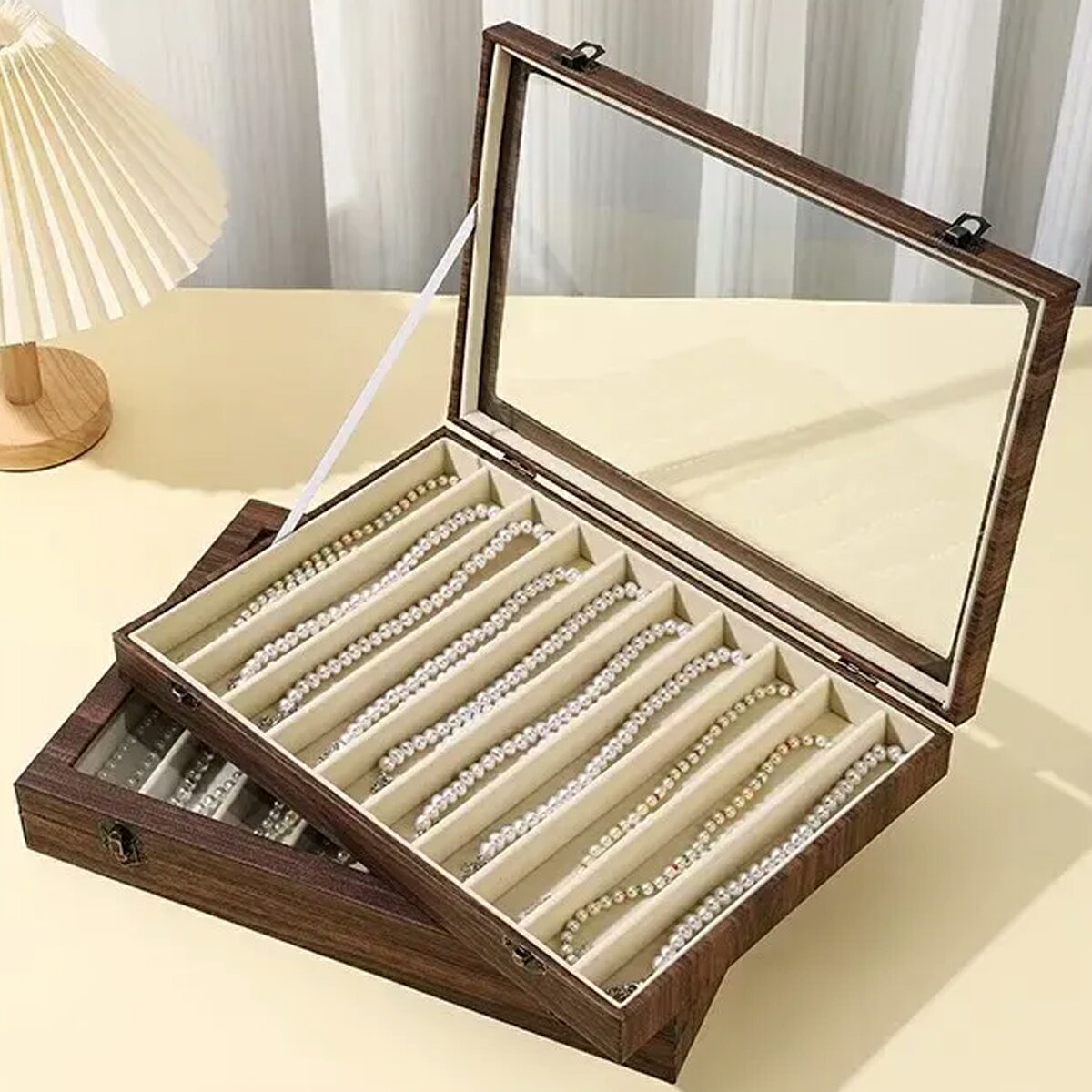 ローズウッドガラスディスプレイケース(ネックレス・ブレスレット・時計用)ジュエリーボックス 木目 ベルベット 収納 ウオッチ 首飾り チョーカー 長いもの アクセサリー プレゼント ディスプレイ ショーケース 宝石箱 業者 写真撮影用 メンズ レディース 男性 女性