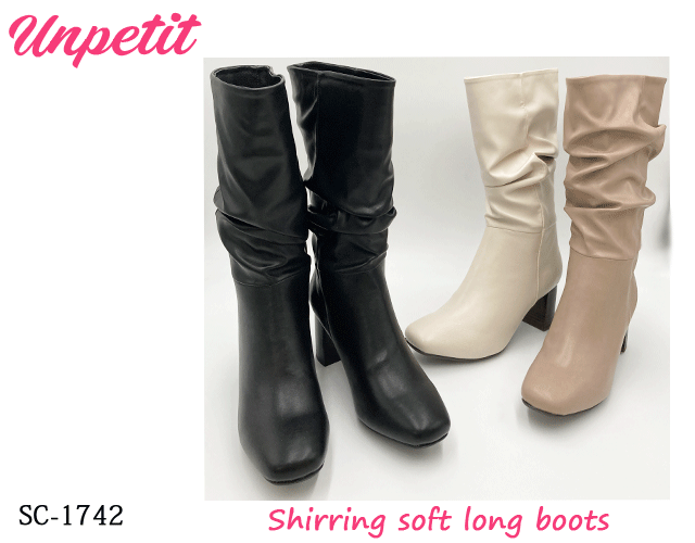 【在庫限り】アンペティット unpetit シャーリング ソフト PU ロング ブーツ ヒール 7cm 足先 あたたかい 起毛 インソール 筒丈 27cm キレイめ ソフト 柔らかい レディース チャンキー sc1742 ブラック ベージュ アイボリー S M L LL