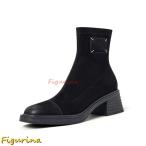 厚底 スクエアトゥ ストレッチブーツ ショートブーツ レディース 黒 ブーツ 太ヒール バックジップ 皮革 レザー スエード チャンキーヒール 6.5cmヒール