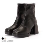 厚底 ショートブーツ センターシーム PUレザー スクエアトゥチャンキーヒール ボリュームソール ストレッチ スムース レディース 春 秋