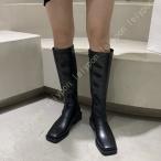 ロングブーツ レディースブーツ ストレッチ レディース ローヒール スクエアトゥ レザー調 スムース セクシー ファッション 長靴 オシャレ レインシューズ 黒