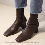 ブーツ レディース ショート ストレッチ スクエアトゥ チャンキーヒール 小さい ブラック 黒 ブラウン ソックスブーツ スムース ファスナー 秋冬 通勤
