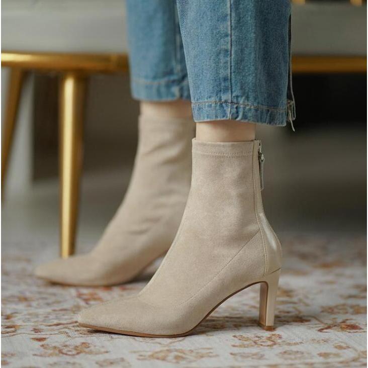 【期間限定10%OFF】ショートブーツ ブーティー 靴 サイドゴア ピンヒール ポインテッドトゥ 6cmヒール スムース スエード きれい 美脚効果 軽い
