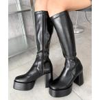 ブーツ スクエアトゥ プラットフォームストレッチロングブーツ レディース