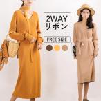 ワンピース レディース 長袖 ニット ひざ丈 細リブ Vネック 薄手 リボンベルト JOCOSA 8807 あったかニット 防寒