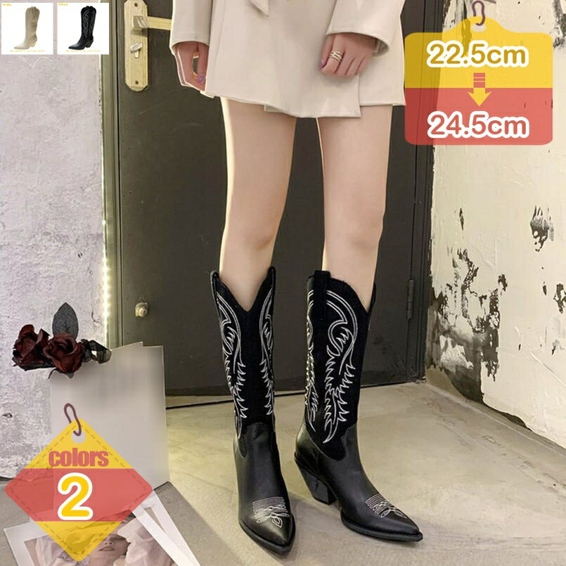 ロングウエスタンブーツ レディース ウエスタンブーツ ロングブーツ 太めヒール 5.5cm チャンキーヒール ブーツ ロング 黒 ブラック ブラウン 白 ホワイト