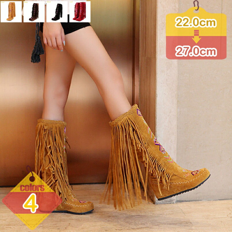 ミドルブーツ レディース ウェスタンブーツ 軽量 耐磨耗 膝下丈 秋 刺繍 身長アップ 安定感 ゴムソール 滑り止め チャンキーヒール 7.5cm ヴィンテージ レトロ調 リーガル お出かけ 通学