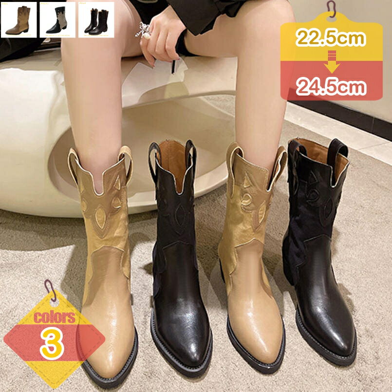 ウエスタンブーツ ミドル丈 レディース ロングブーツ ウエスタン ブーツ 太めヒール 4.5cm ローヒール